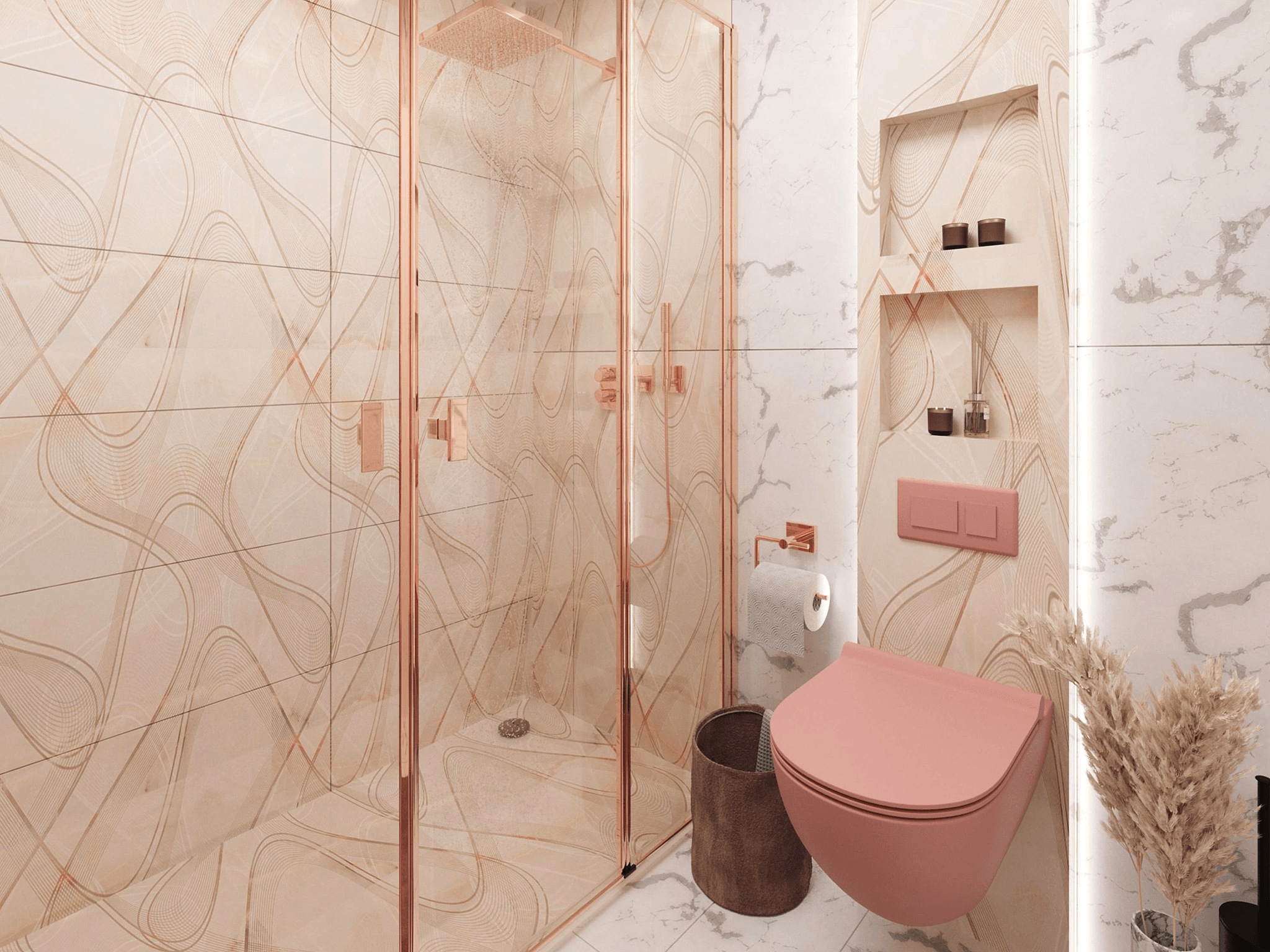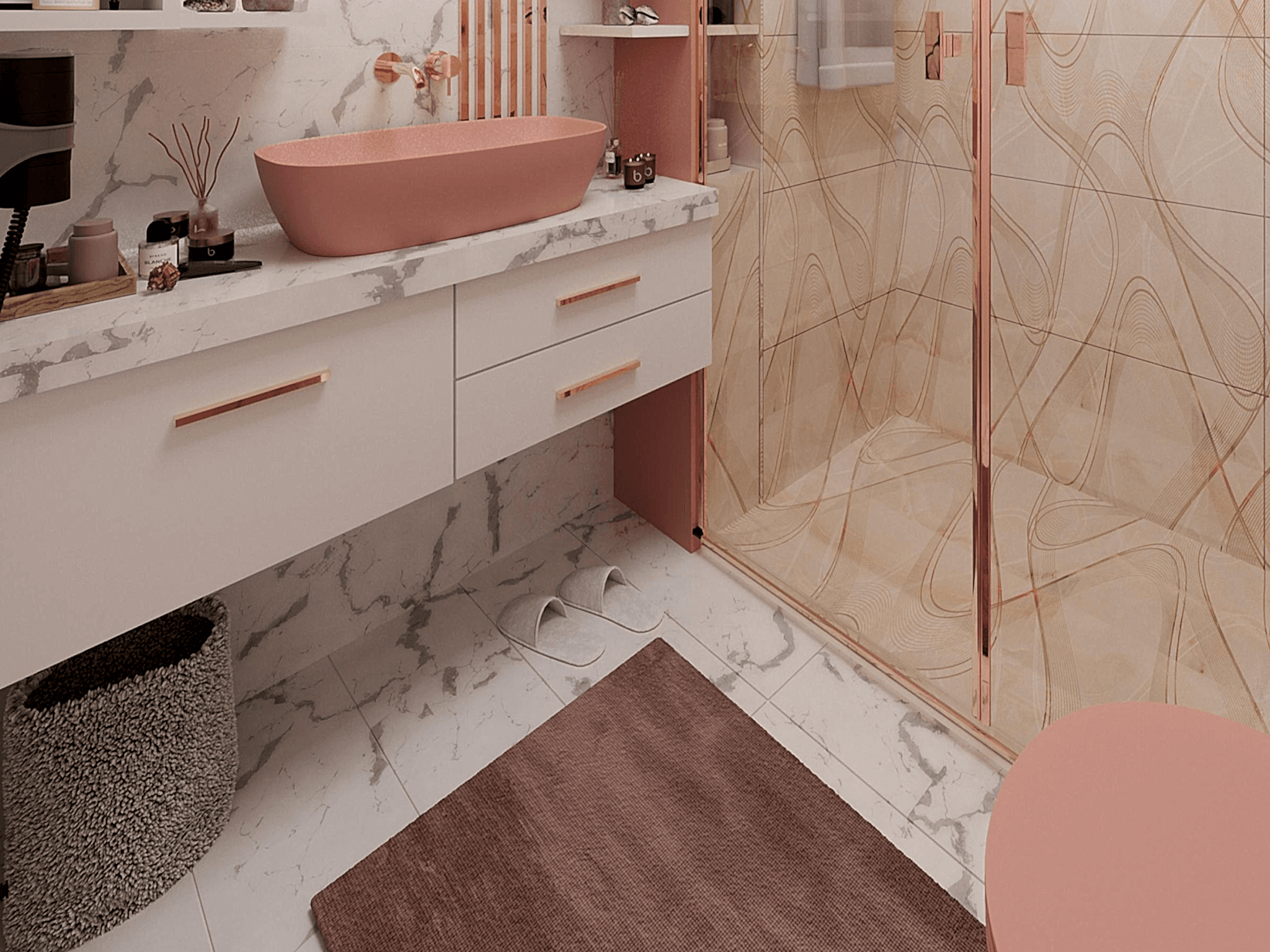 - Metal Fixtures: All metal details in the bathroom have been painted in rose gold to achieve a modern and elegant look.