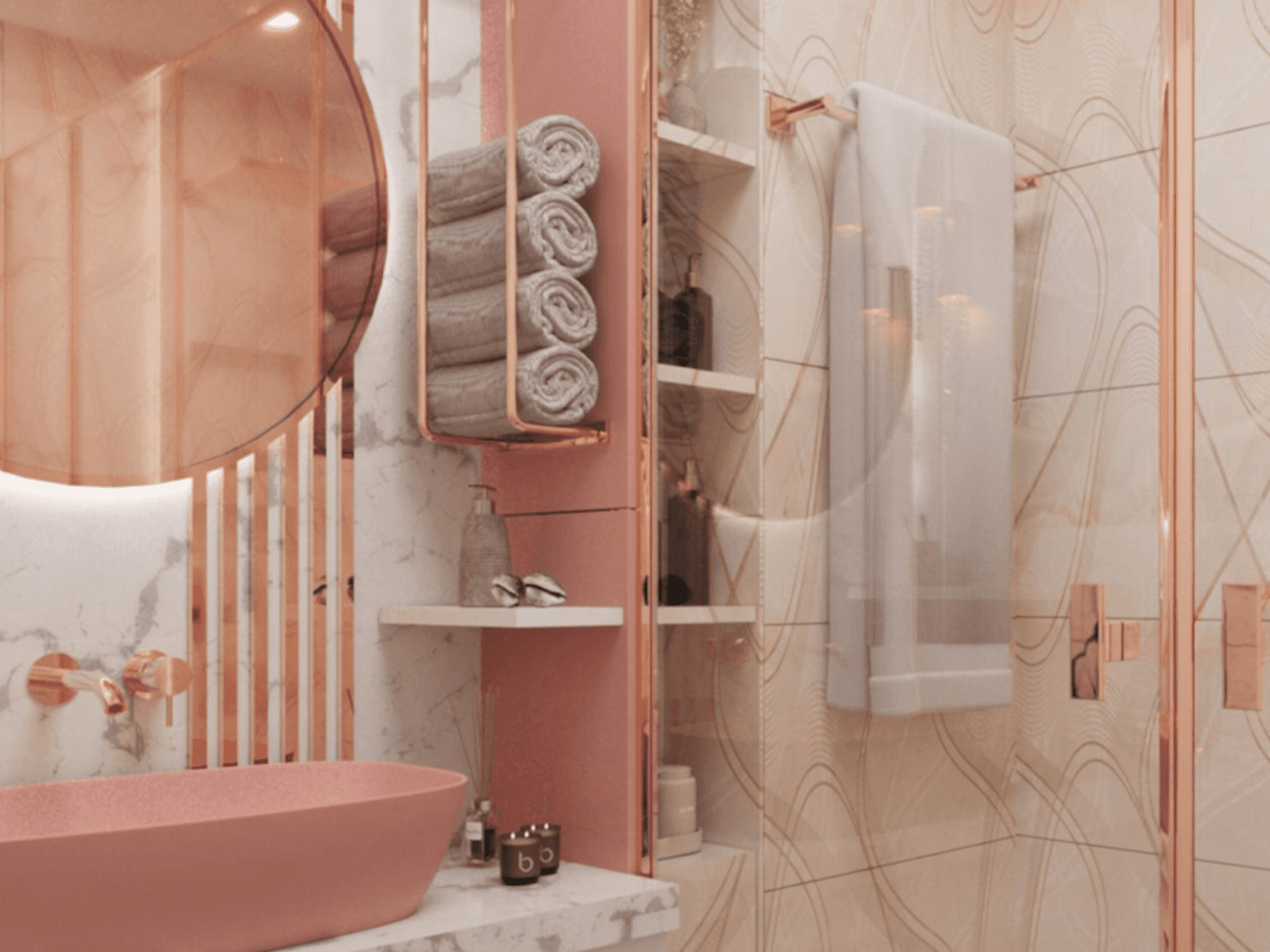 In this feminine luxury bathroom design, color harmony and creating a spacious area are prioritized. The salmon color and rose gold tones add elegant femininity to the bathroom, while carefully planned layout and lighting solutions ensure the space feels open and airy. Every corner of the bathroom is designed with both aesthetics and functionality in mind.