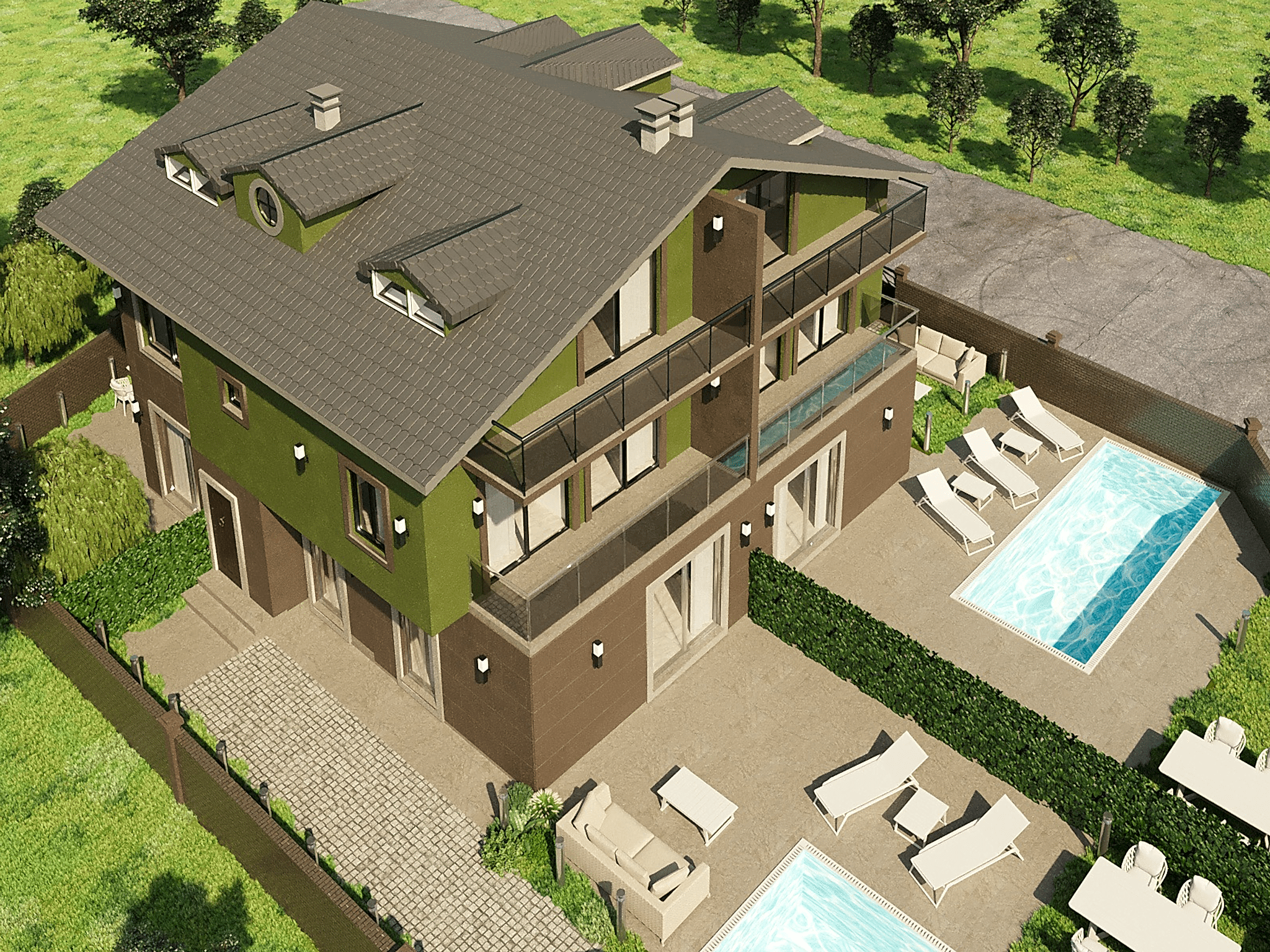 This project showcases a cohesive modern and natural approach to the interior and exterior design of a villa situated within nature. By using green tones and natural materials, a harmonious and organic connection has been established between the villa and its surrounding environment. The interior spaces create a warm and serene atmosphere, while the exterior design ensures the villa blends seamlessly with its surroundings. This villa design offers a modern living space that is intimately connected with nature.