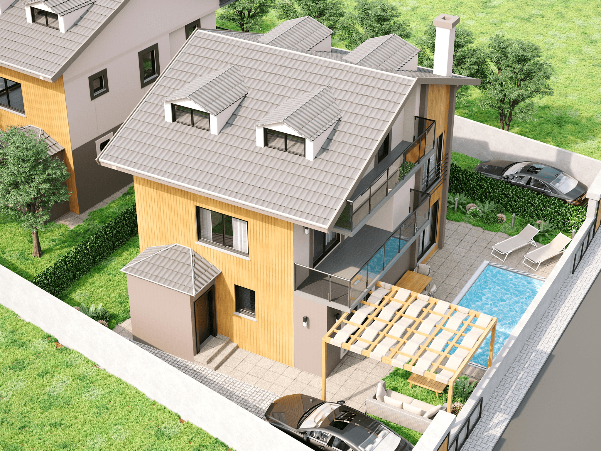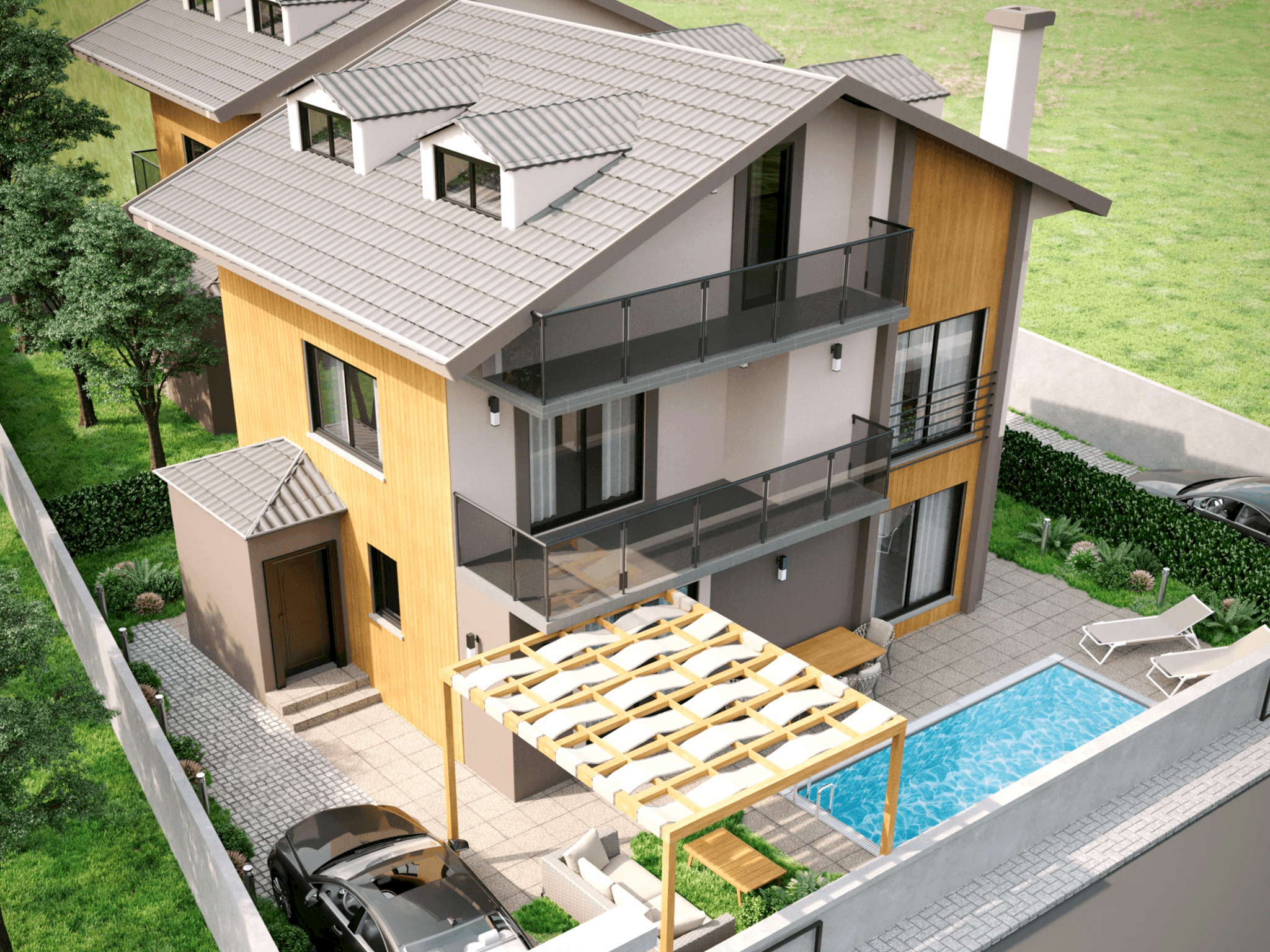 - Exterior: Dış cephede doğal ahşap paneller kullanılarak, villanın modern ve zarif bir görünüm kazanması sağlanmıştır. Ahşap malzeme, yapıya doğallık katarken, çevresiyle uyum içinde bir estetik sunmaktadır.