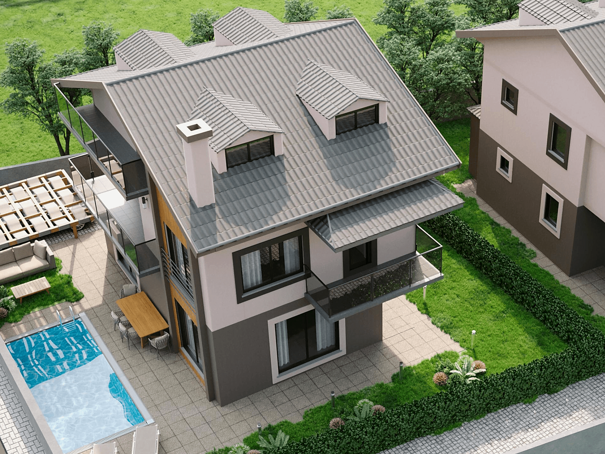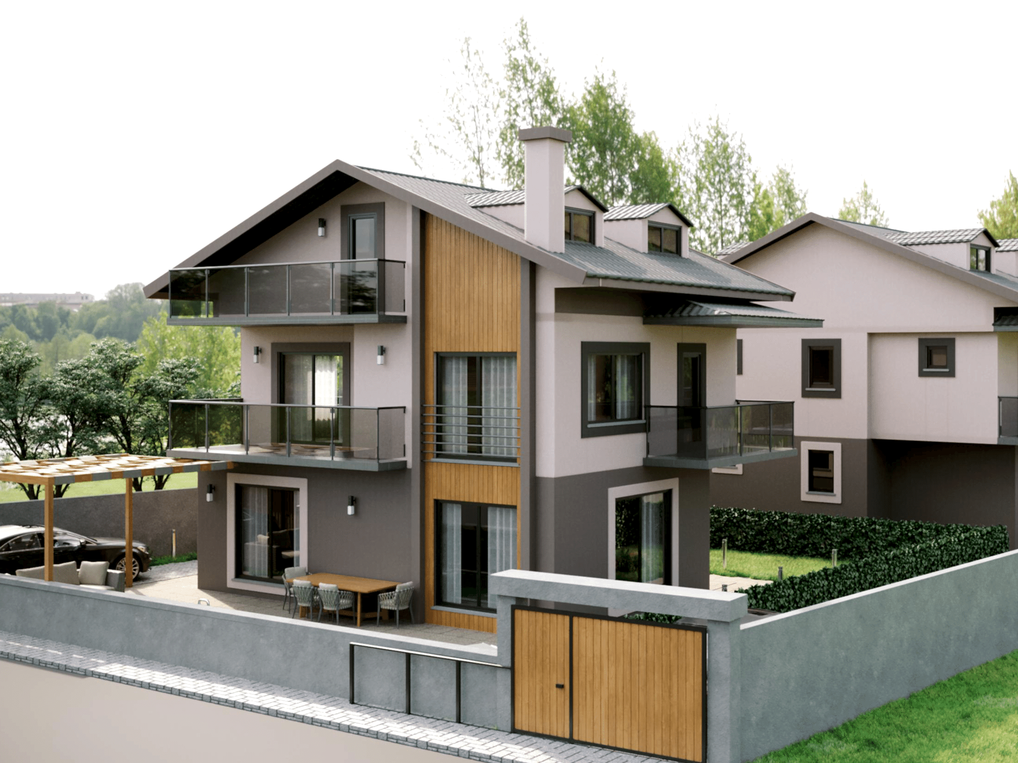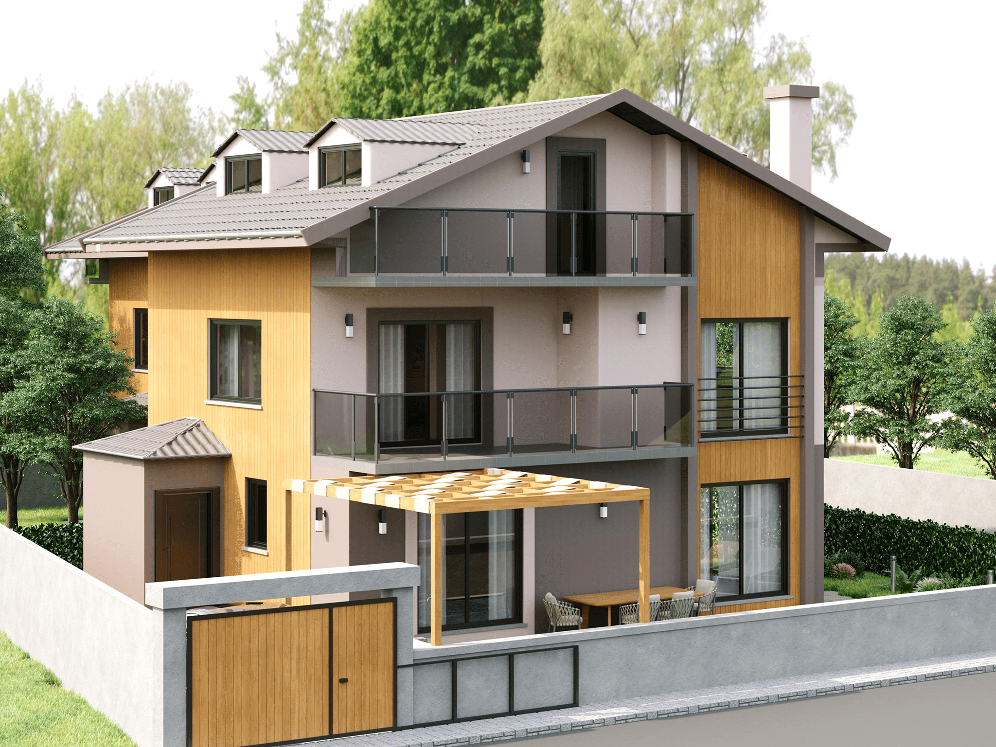 The “Villa Interior and Exterior Design” project combines modern aesthetic sensibilities with natural materials, offering users a living space that is both visually satisfying and functionally comfortable. The natural wood panels used on the exterior add warmth and a sense of nature to the villa, while the interior layout is organized to meet the needs of the users. This project stands out as a design that perfectly harmonizes aesthetics and functionality, reflecting a modern lifestyle.
